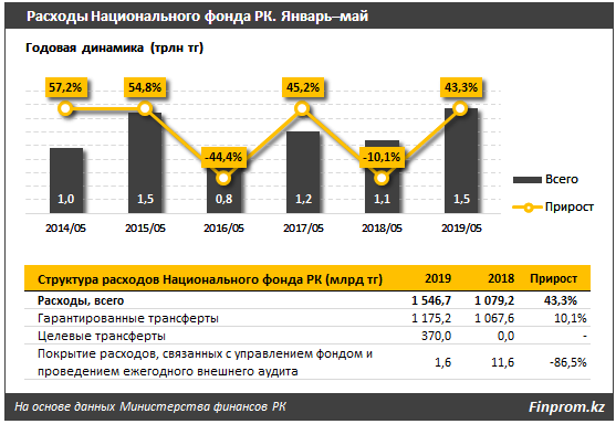 В свою очередь расходы Нацфонда увеличились на 43,3 процента год к году и составили 1,5 триллиона тенге. За аналогичный период прошлого года расходы были равны 1,1 триллиона тенге, при снижении на 10,1 процента. За пять месяцев текущего года расходы Нацфонда превысили доходы на 73,3 миллиарда тенге.