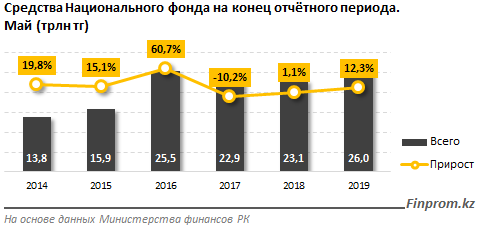 На конец мая 2019 года средства Национального фонда РК составили 26 триллионов тенге, за год сумма увеличилась на 12,3 процента, передает Tengrinews.kz со ссылкой на Finprom.kz. В аналогичном периоде прошлого года средства Нацфонда были равны 23,1 триллиона тенге, прирост составлял 1,1 процента год к году.