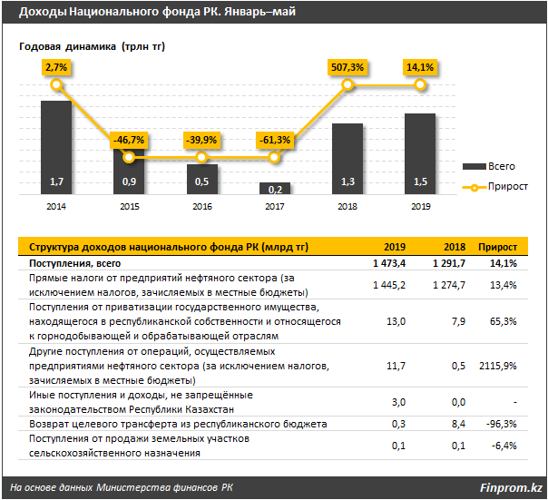 За пять месяцев текущего года почти весь доход Нацфонда приходится на прямые налоги от предприятий нефтяного сектора, доля составила 98,1 процента, или 1,4 триллиона тенге от общей суммы доходов.