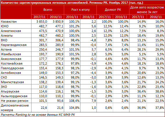 В регионе зарегистрировано по состоянию на ноябрь 2017 года 193,7 тысячи автомобилей. Из них доля авто возрастом менее трех лет составляет 5,1 процента. При этом за год показатель упал на 0,4 процента. В свою очередь, наибольшая доля новых авто - в Атырауской области - 36,4 процента. Но и здесь она упала за год на 4 процента.