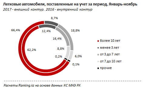 Как отмечают исследователи, в Казахстане растет количество поставленных на учет авто по сравнению с прошлым годом. Этот показатель составил 750,1 тысячи. Растет в этом числе и доля авто старше десяти лет - с 62,2 процента за январь-ноябрь 2016 года до 66,4 процента за аналогичный период 2017-го.