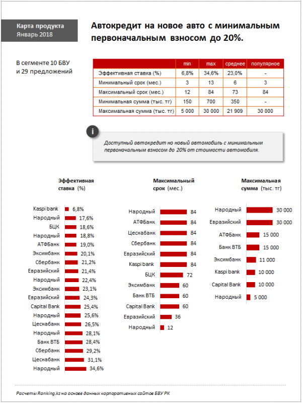 Также два банка предлагают автокредит на новый автомобиль без первоначального взноса: Народный банк - для участников зарплатного проекта на сумму до пяти миллионов тенге, и Цеснабанк - при предоставлении в качестве залогового обеспечения недвижимого имущества.