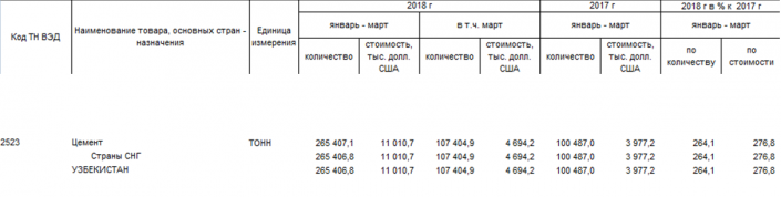 В январе-марте 2018 года экспорт цемента в Узбекистан составил около 265 тысяч тонн и принес 11 миллионов долларов. За аналогичный период 2017 года цифры были отмечены на уровне 100 тысяч тонн и 3,9 миллиона долларов. Экспорт увеличился на 264,1 и 276,8 процента соответственно.