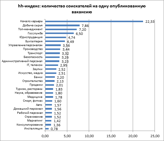 "Самая большая конкуренция среди представителей профессиональных областей приходится на: "начало карьеры" - 22 человека на место, добыча сырья - 7,8 процента, топ-менеджмент - 7,2 процента, юриспруденция - 4,7 и бухгалтерия - 4,48 процента кандидата на одну вакансию соответственно. Если же говорить о представителях рабочих профессий, то налицо дефицит "синих воротничков". В сферах "строительство" - всего 2,13 человека на одно вакантное место, "рабочий персонал" - 1,52 соискателя на одну вакансию, то есть работодатели испытывают трудности с подбором персонала на рабочие вакансии и вынуждены "побороться" за них", - говорится в распространенном сообщении.