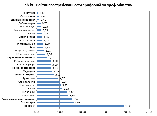 Согласно исследованию, самыми востребованными специалистами являются sales-представители (19 процентов всех предложений работы), с большим отрывом от работников продаж в топ-5 востребованных специалистов также входят: бухгалтеры (8,3 процента), административный персонал (7,67 процента), маркетологи (7,3 процента) и сотрудники сферы IT, телеком (6,1 процента).