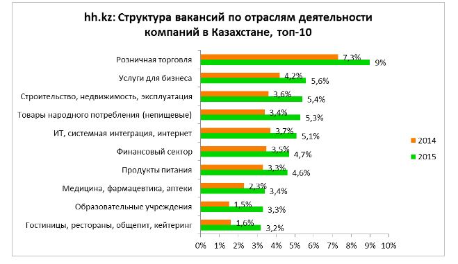 Кроме того, Быченко поделилась мнением о том, что лидерами по количеству опубликованных вакансий в 2015 году стали компании из розничной сферы, организации, оказывающие услуги для бизнеса, а также занимающиеся строительством и недвижимостью. А вот, к примеру, компании, которые оказывают финансовые услуги, переместились с пятого на шестое место, организации в сфере ИТ - с третьего на пятое место.