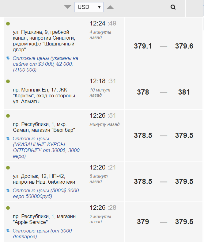 В обменных пунктах Нур-Султана и Алматы, по данным kurs.kz, американскую валюту продают от 379,5 до 381 тенге.