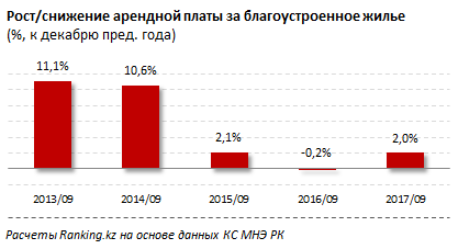 В целом сообщается, что аренда жилья в Казахстане продолжает дорожать четвертый месяц подряд - в сентябре цены на рынке выросли еще на 0,4 процента. За текущий год (с января по сентябрь) стоимость аренды благоустроенного жилья в республике подорожала на 2 процента. В свою очередь, за аналогичный период 2016 года аренда благоустроенных квартир и домов, напротив, дешевела - минус 0,2 процента.