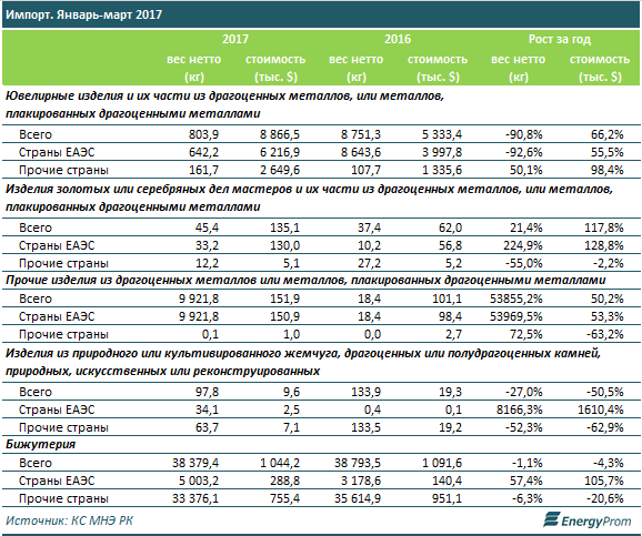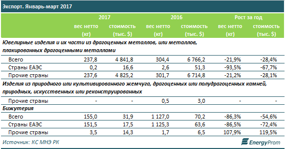 Экспорт Казахстаном ювелирных изделий по итогам первого квартала также сократился - минус 21,9 процента в натуральном выражении и минус 28,4 процента в стоимостном, как и экспорт бижутерии - минус 86,2 процента в килограммах и минус 54,6 процента в деньгах.