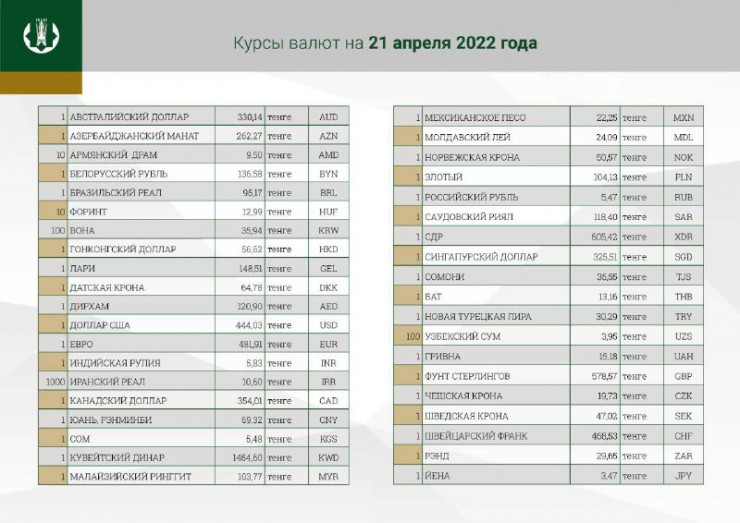 В четверг курс доллара будет равен 444,03 тенге. Отметим, что официальный курс американской валюты на 20 апреля составляет 443,57 тенге.