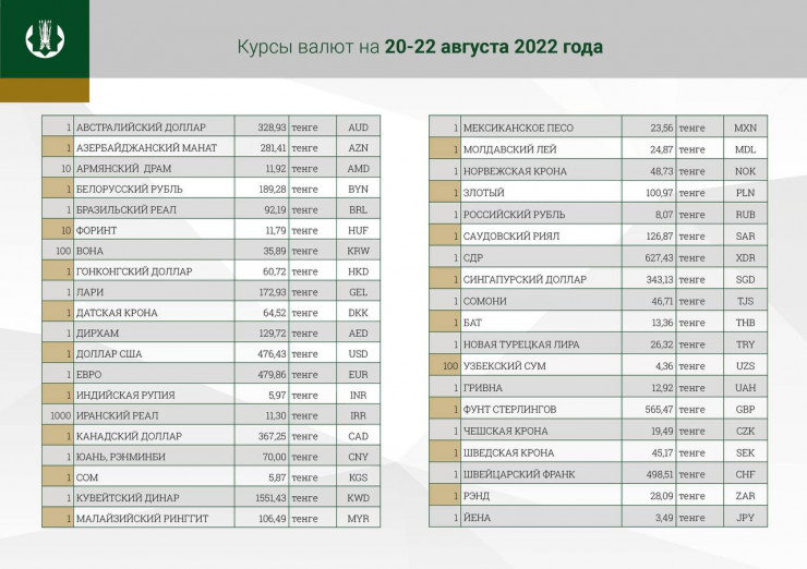 В выходные дни и понедельник официальный курс доллара будет равен 476,43 тенге. Отметим, что официальный курс американской валюты на 19 августа составляет 475,94 тенге.