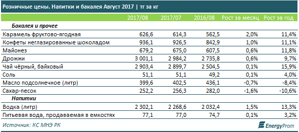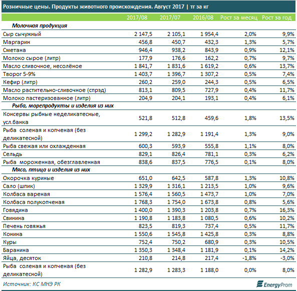 Среди продуктов животного происхождения сильнее всего за месяц подорожала молочка. Так, сыр вырос в цене к июлю сразу на 2 процента, до 2,15 тысячи тенге, сырое молоко, сметана и маргарин - на 0,7-1,3 процента, пастеризованное молоко, кефир, сливочное масло и спред, а также творог - на 0,4-0,6 процента.