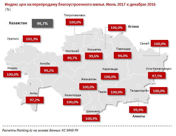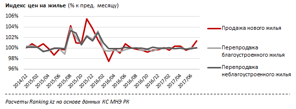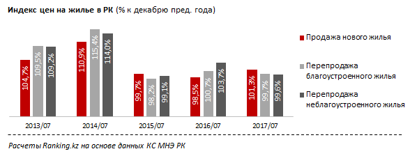 "Эта ситуация контрастирует с картиной динамики цен на рынке жилой недвижимости в прошлом году. Напомним, что год назад за аналогичный период цены на новое жилье упали на 1,5 процента. Зато стоимость вторичного жилья поднялась: на благоустроенные квартиры - на 0,7 процента с декабря 2015 по июль 2016, на неблагоустроенное жилье - сразу на 3,7 процента", - отмечают в Ranking.kz.