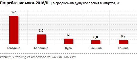 Самое популярное мясо в домохозяйствах РК - говядина: 5,7 килограмма на душу населения, что на 3,2 процента меньше, чем в прошлом квартале.