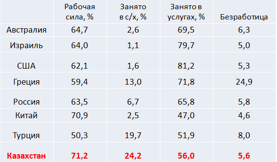 Также социолог отметила, что в сфере услуг занято всего 56 процентов казахстанцев, поясняя, что этот показатель, как и доля жителей, задействованных в сельском хозяйстве, коррелирует с показателем реальной модернизации и индустриализации.