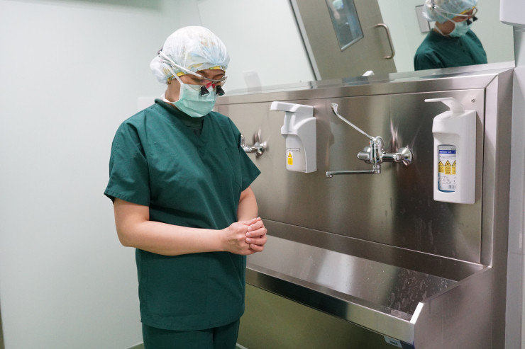 Хирург проверяет настройку микрохирургических очков для операции на пальцах