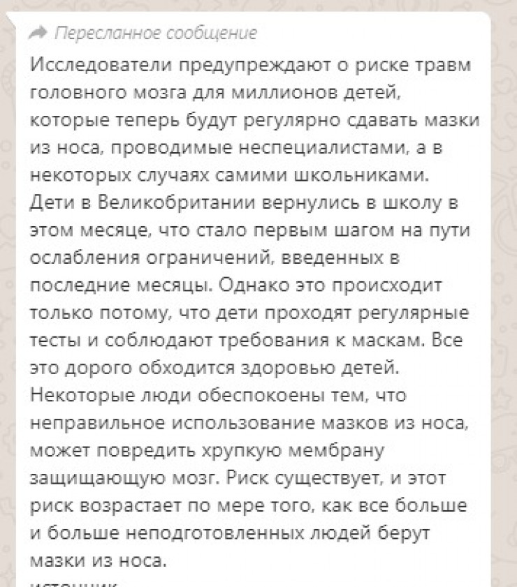 Казахстанцы встревожены сообщением, которое распространяется в Telegram. В тексте сказано, что специалисты пришли к выводу о том, что метод забора биоматериала для ПЦР-анализа на СOVID-19 значительно повышает риск травм мозга у детей, передает Tengrinews.kz со ссылкой на Stopfake.kz.