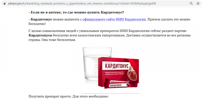 На сайте отмечается, что официальные аптеки лекарство не продают, но препарат можно заказать на сайте ННКЦ. Однако активная ссылка на самом деле переводит читателей на тот же сайт с рекламой.