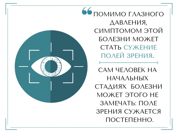 Помимо глазного давления, симптомом этой болезни может стать сужение полей зрения.  Сам человек на  начальных  стадиях  болезни может этого не  замечать:  поле зрения сужается постепенно. В конечном итоге пациент начинает видеть, будто смотрит в трубочку. Мы называем такой симптом трубчатым  зрением, который может привести к разным трудностям в обычной жизни. Если такой пациент водит автомобиль, то  он часто может попадать в аварии, так как не видит происходящее справа и слева,  при ходьбе он может спотыкаться.