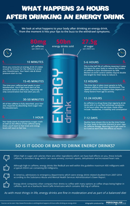 Несмотря на предупреждения о вреде курения и употребления энергетических коктейлей, огромная армия пользователей продолжает курить и пить. Британский портал Personalise представил инфографику, объясняющую, что происходит с организмом человека после одной баночки энергетического напитка.