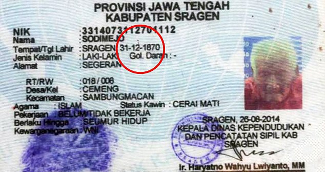 Если индонезийцу действительно 145 лет, то он значительно старше обладательницы титула самого старого человека в мире - француженки Жанны Кальман, которой 122 года.
