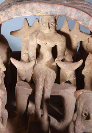 Дама зубчатого трона - это наиболее подходящее имя для этого загадочного и неповторимого артефакта, который датируется 2700-м годом до нашей эры. Артефакт остается самым странным древним предметом из когда-либо найденных человеком. Убедившись, что это не подделка, итальянский археолог Массимо Видале и его команда зафиксировали уникальный внешний вид артефакта для потомков. Объект этот имеет форму колесницы или лодки, на носу которой установлена фигурка бычьей головы. На "лодке" есть 15 человеческих фигур, которые образуют нечто, что можно описать словом "процессия". На этих фигурах есть следы черной, красной и желтой краски. Некоторые фигурки в "процессии" имеют на голове одни и те же украшения, и они носят конические "мантии", которых не наблюдается на других подобных статуэтках. Также можно увидеть женскую фигуру, которая сидит на "зубчатом троне", откуда и пошло название артефакта. Исследователи пришли к выводу, что "дама" была создана древней индской цивилизацией, но они не смогли выяснить смысл и цель создания данного артефакта. Нет никаких доказательств того, что во времена индской цивилизации использовались четырехколесные транспортные средства, и непонятно, был ли этот артефакт создан для ритуального применения, или для чего-то другого, более практичного и рационального.