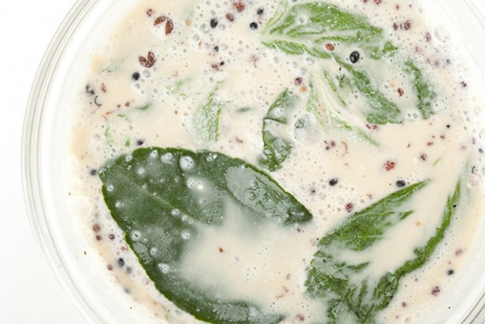 1. Крупно порубите тархун, добавьте воду, мед, два вида горчицы и растительное масло.