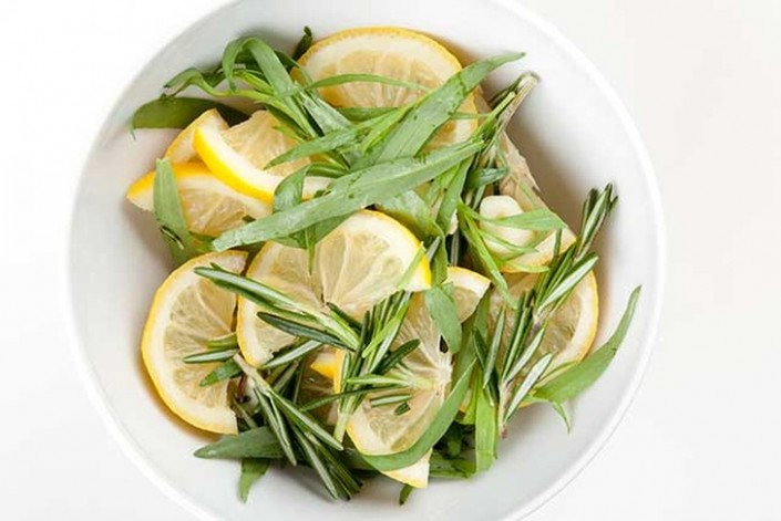 1. Лимоны крупно нарежьте, смешайте с крупно нарезанным чесноком, листьями розмарина и эстрагона.