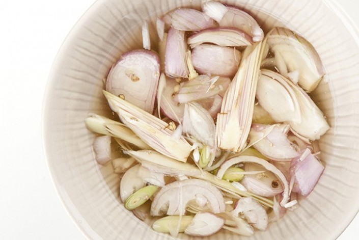 1. Очистите лук-шалот и крупно порежьте. К луку добавьте воду, вино, соль, крупно нарезанное лимонное сорго.