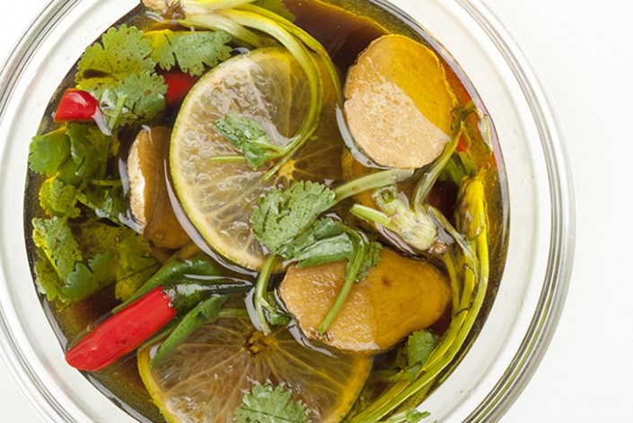 1. Смешайте молоко с соевым соусом и жидким медом. Туда же добавьте листья лайма и мяты, сычуаньский перец. Перемешайте.