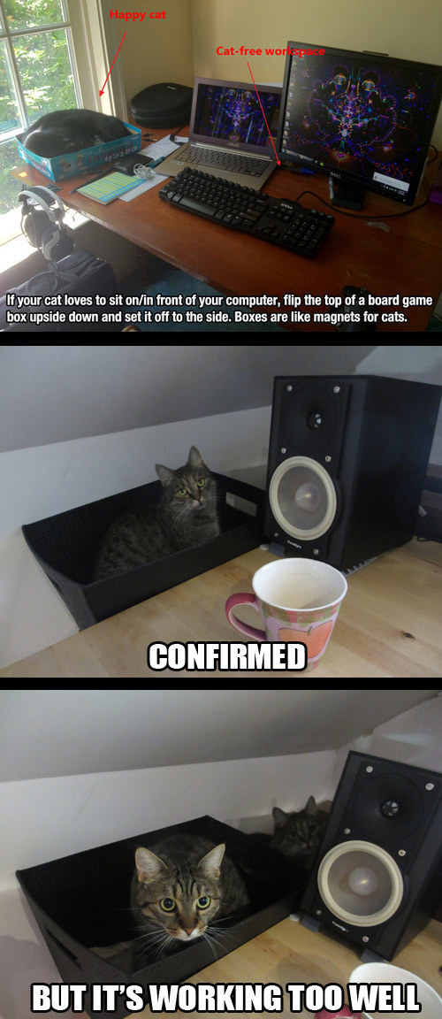 Если вы работаете за компьютером, то несомненно знаете потрясающую способность кошачьих располагаться прямо на вашей клавиатуре. А ведь достаточно просто поставить рядом с собой на столе пустую коробку, и кот сразу перестанет вам досаждать.