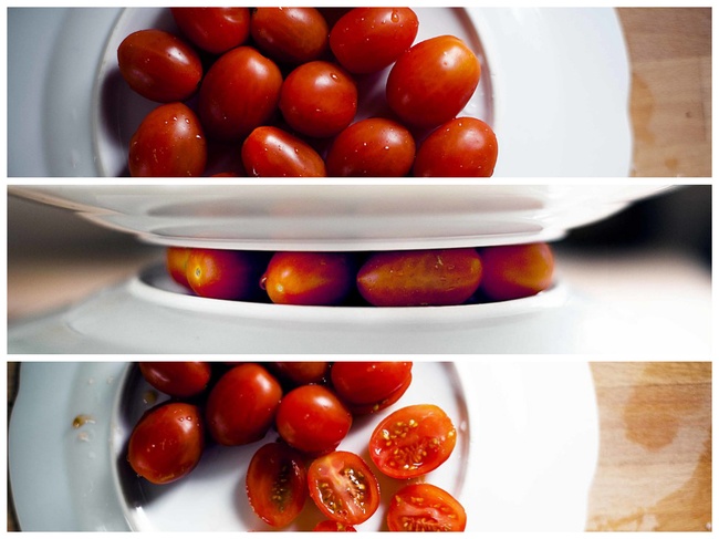 Положите помидоры между двумя плоскими тарелками и проведите острым ножом. Такой прием также можно использовать для винограда.