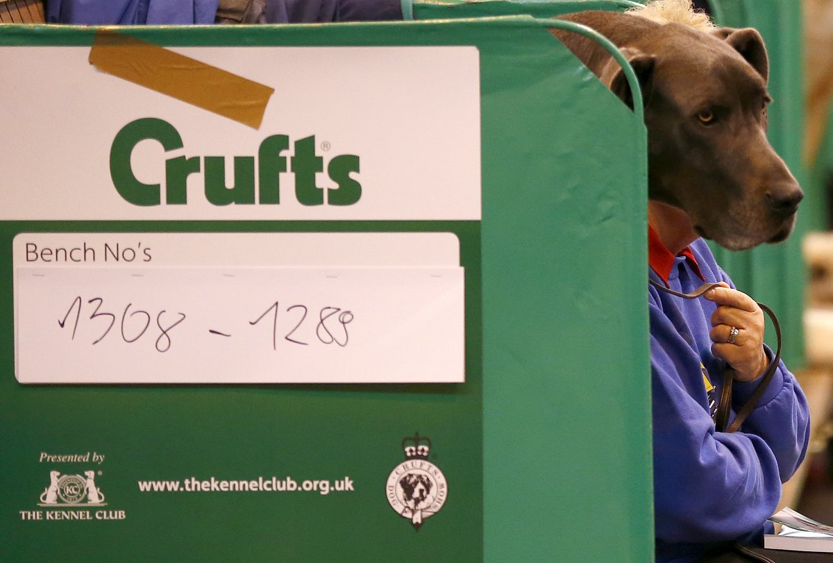 Собака или человек? Датский дог закрывает лицо своего владельца на выставке в Бирмингеме.