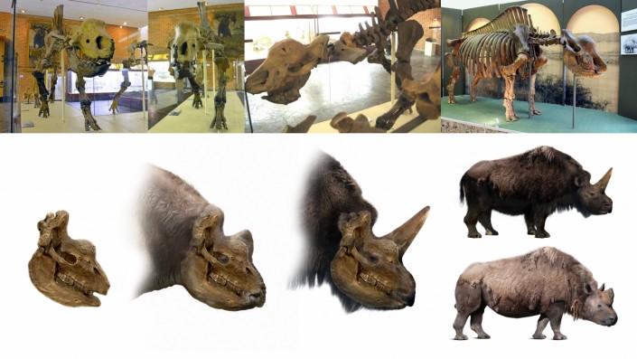 Реконструкции внешнего облика "сибирского единорога" Романа Учителя и скелеты в экспозициях Палеонтологического музея в Москве и Ставропольского краеведческого музея