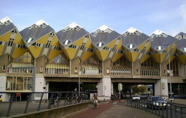 Так называемые "Кубические дома" или "Дома-кубы" выглядят совершенно безумно, но на деле оказываются блестящим примером продуманного творческого подхода. Установленный под углом в 45 градусов на шестигранной колонне параллелепипед каждого дома надежно соединен с соседним. Результатом дерзкой задумки явилась постройка с высокой плотностью и удивительным видом.