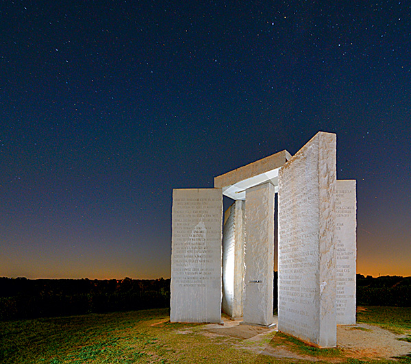 В 1979 году некто под псевдонимом R.C. Christian заказал строительной фирме изготовление и установку монумента - конструкции из шести гранитных монолитов общим весом более 100 тонн. На четырех боковых плитах выгравированы десять заповедей потомкам на восьми языках, включая русский. Последний пункт гласит: "Не будьте раком для Земли, природе тоже оставьте место!"