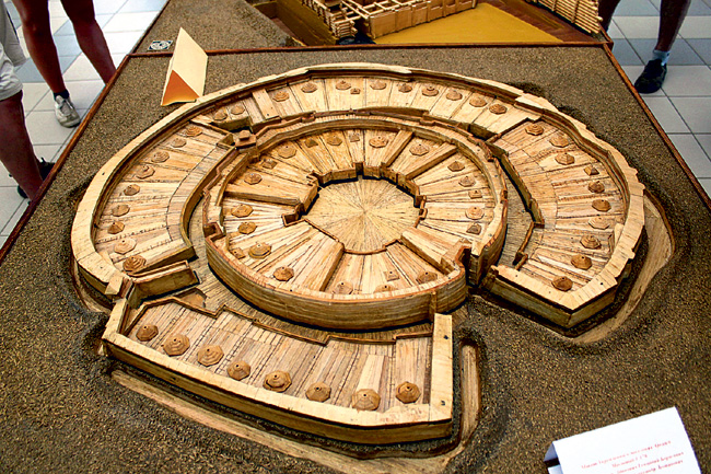 Поселение эпохи бронзы (III-II тысячелетие до н. э.) находится на той же широте, что и Стоунхендж. Совпадение? Ученые не знают. Два ряда круговых стен (диаметр дальней - 170 метров), система водостоков и канализация, колодец в каждом доме - свидетельствуют о высокоразвитой культуре. Памятник был обнаружен студентами и школьниками из археологической экспедиции в 1987 году. (На фото - модель-реконструкция.)