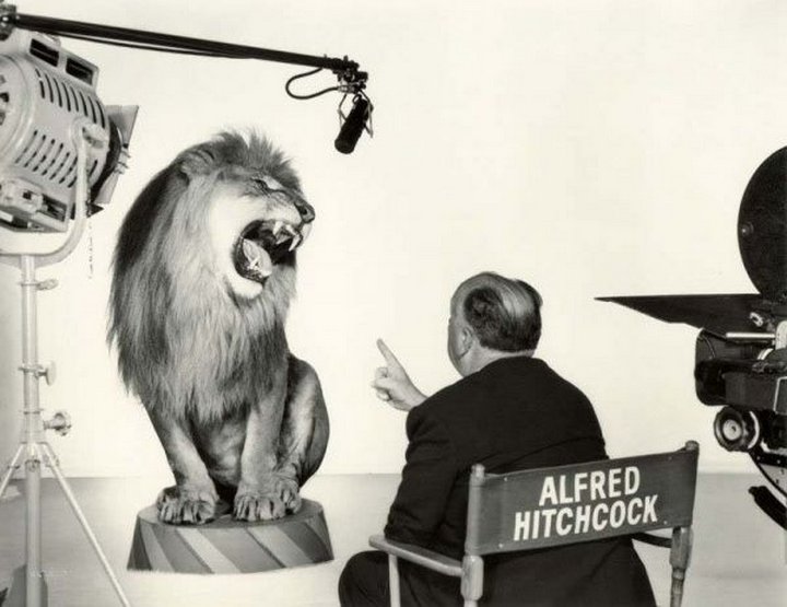 Альфред Хичкок, руководящий львом во время съемки легендарной заставки студии Metro-Goldwyn-Mayer, 1958 год.
