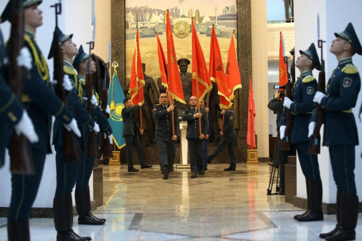 Во время Великой Отечественной войны из советского Казахстана на фронт отправился каждый пятый житель - 1,2 миллиона человек. Под боевыми знаменами, пройдя тяжелые испытания, они победоносно дошли до Берлина. Теперь 23 боевых знамени вручили войсковым частям, преемникам тех самых дивизий, в которых воевали наши предки. Военнослужащие ВС РК могут увидеть боевые знамена в музеях и воинских частях городов и областей.