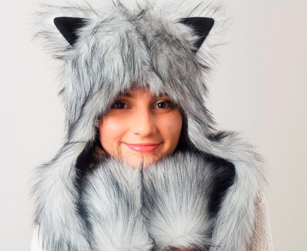 Эта шапка из искусственного меха, хотя по виду и не скажешь. Отличный подарок для девушки, которая без ума от хаски и вообще от всех кошечек-собачек. Греет не только голову, но и руки.