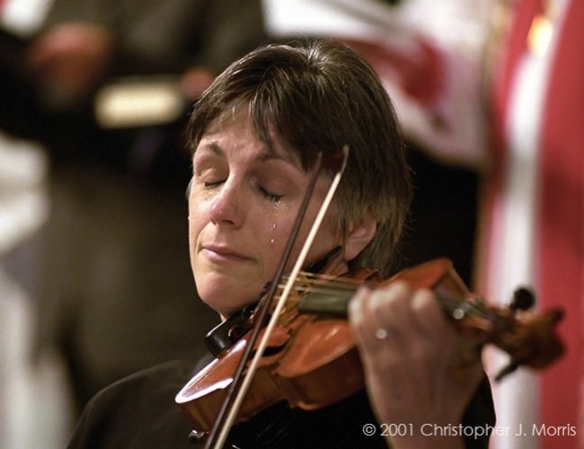 Скрипачка плачет во время службы по жертвам 11 сентября, Ванкувер.