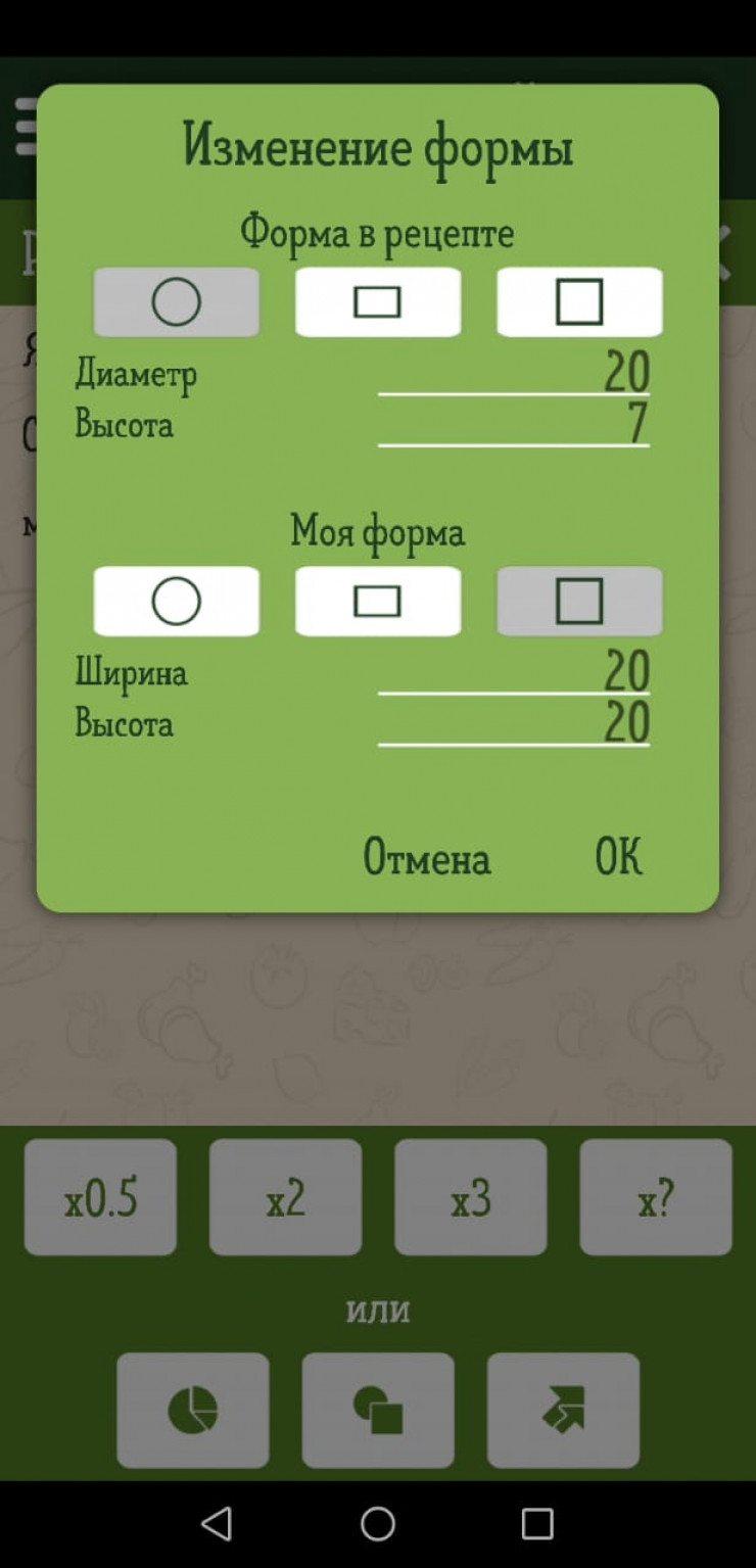 В пересчете по порциям введите, сколько порций указано в рецепте и сколько нужно вам. Если вы готовите десерт, но вас не устраивает форма в рецепте, обозначьте, как вы хотите ее изменить: круг, квадрат, прямоугольник, а также задайте желаемый размер.