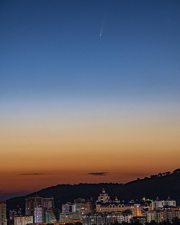 "Эта комета ярчайшая за последние семь лет, поэтому заранее готовился к съемке, нашел подходящую локацию и подождал хорошей погоды. В 4 утра сделал эти снимки с 200-миллиметровым телеобъективом. Комета будет видна приблизительно до 20 июля. Сейчас в Алматы ее видно с 3.30 до 4.30 низко над северо-восточным горизонтом. Комету снял с одного из холмов в Ремизовке. Оттуда хороший вид как раз на северо-восточную часть горизонта", - поделился автор фотографий.