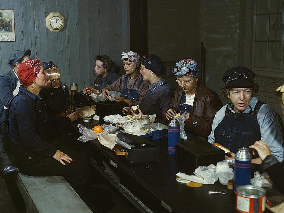 Женщины-железнодорожники на обеденном перерыве, Клинтон, штат Айова, апрель 1943 года