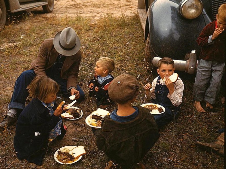 Фермер с детьми на барбекю, Пай-Таун, Нью-Мексико, октябрь 1940 года. Фотограф Ли Рассел