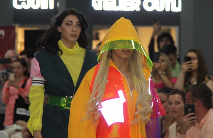 Среди всех коллекций особенно выделялись яркие радужные дождевики из плотного полиэтилена. И это тоже весьма кстати для Батуми, учитывая, что кратковременные дожди осенью и зимой здесь частое явление.