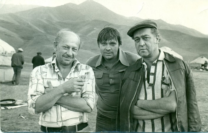 Слева направо: Е. Евстигнеев, О. Видов, В. Сошальский. Надпись на обороте: "Дорогой Саре Камаловне с пожеланиями счастья. Здоровья Вам и Вашим близким. С благодарностью, О. Видов". Алма-Атинская область, 1977 год. Фото из семейного архива С. К. Журабаевой и И. И. Карсакбаева