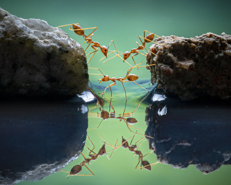 Обыкновенный красный муравей изобретателен в перемещении по местности. Когда впереди идущие муравьи-разведчики сталкиваются с водным препятствием, они интуитивно образуют "муравьиный мост" своими телами, чтобы их товарищи-муравьи в задней части группы могли пересечь его.