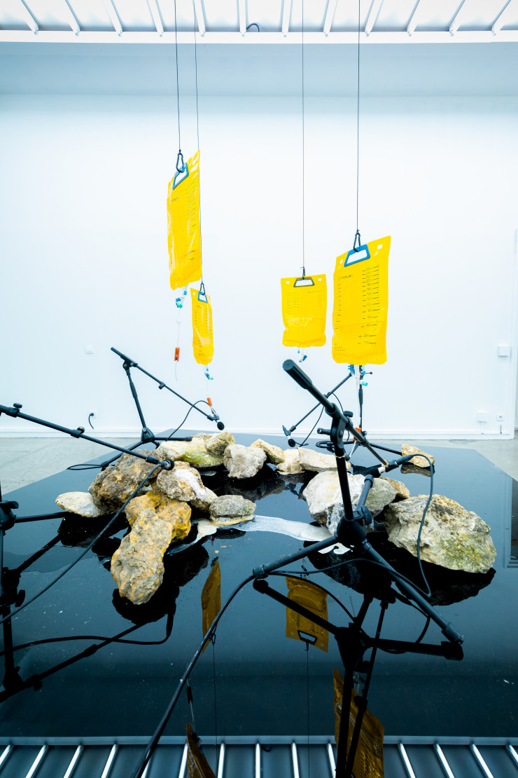Еще один экспонат "О чем поют машины" состоял из микрофона, перед которым экран выдавал тексты - видимо, строчки из песен. Искусственный кто-то пел что-то на языке роботов, издавал звуки ненастроенной гитары.