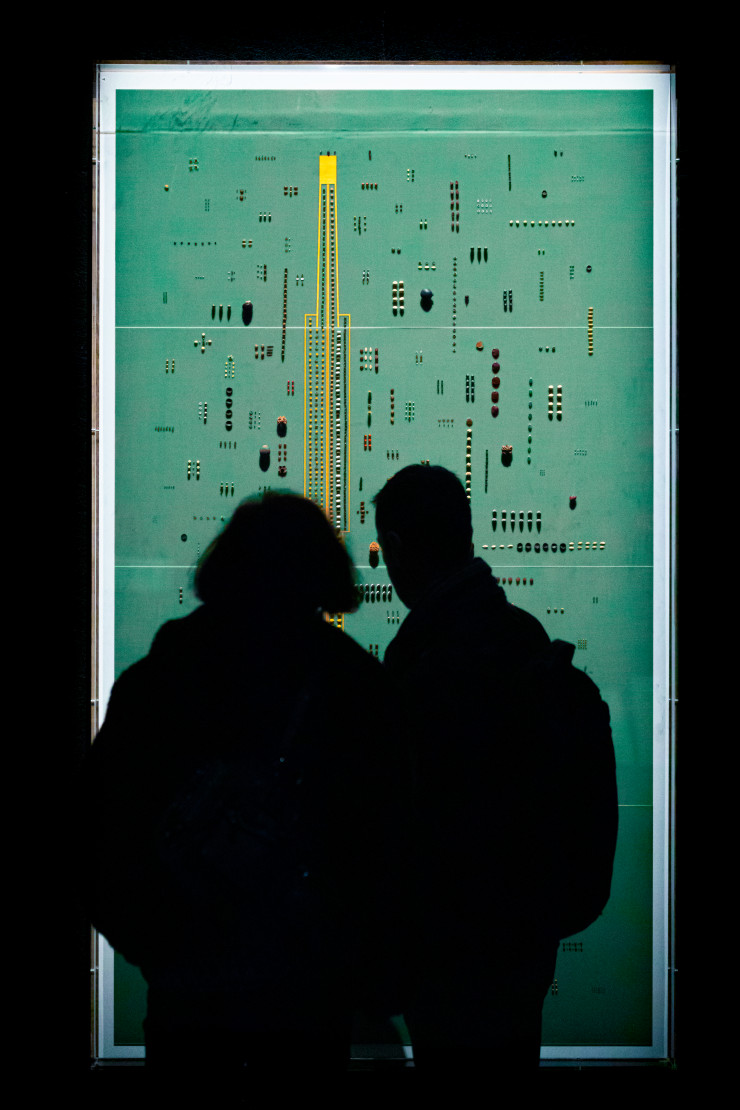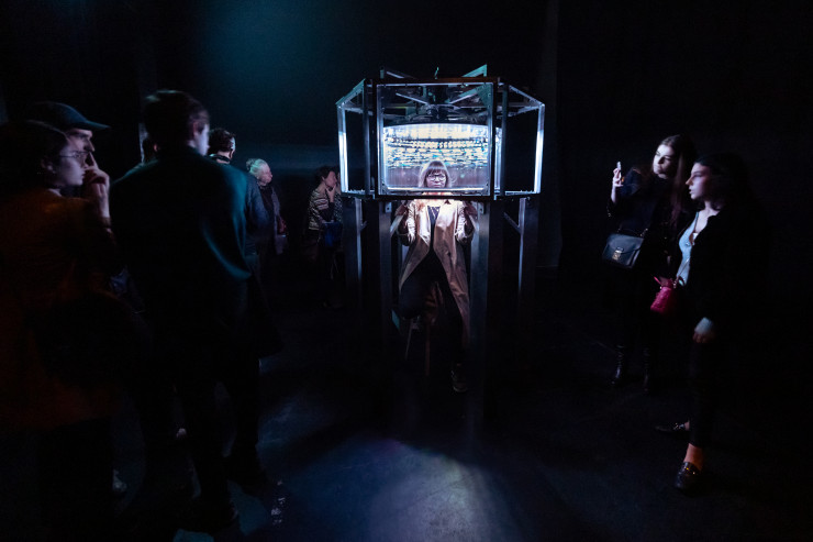 Вход на цифровую выставку был обозначен большим дроном, похожим на худого паука. Мини-дисплей с бегущей строкой "Пока все идет хорошо?" напоминал о названии выставки и о стиле диско 80-х годов.
